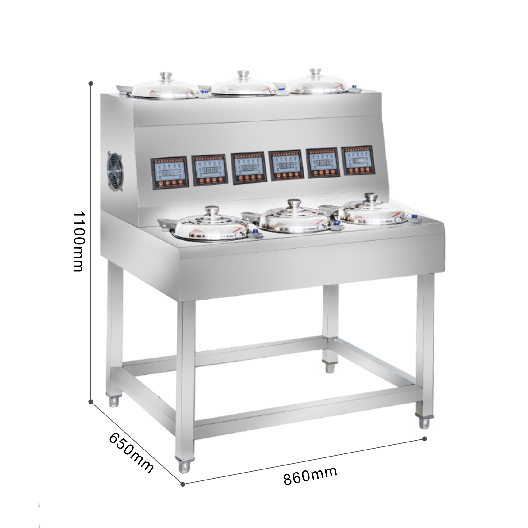 上述三種機(jī)型可以混搭,例如:一臺(tái)10頭的機(jī),其中可以做2個(gè)智能煲仔爐、4個(gè)專業(yè)煲仔飯、2個(gè)無蓋平頭爐,這樣即可滿足全天候,多品種餐飲制作。